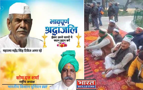 भारतीय किसान यूनियन वेलफेयर फाउंडेशन के सोमदत्त शर्मा राष्ट्रीय अध्यक्ष एवं किसान भाईयों ने आज  बाबा महेंद्र सिंह टिकैत की  जयंती पर  विनम्र सच्ची श्रद्धांजलि दी गई। वही इस मौके पर   बीकेयू राष्ट्रीय अध्यक्ष सोमदत्त ने कहा कि किसानों और मजदूरों के लिए उनके जज्बात उनका हौसला किसानों के प्रति उनके ह्रदय की पीड़ा देश के सत्ताधारियों के साथ उनका संघर्ष एक सच्चे ईमानदार सादगी से परिपूर्ण उनका व्यक्तित्व उनको अंतर्राष्ट्रीय पहचान दिलाता है। उन्हें युग पुरोधा बनाता है। जिस प्रकार आम आदमियों को साथ लेकर संगठित शक्ति से उन्होंने अनेकों बार सत्ताधीशों की मनमानी पर अंकुश लगाया था। और किसानों को उनके अधिकारों के प्रति जागृत किया था।
