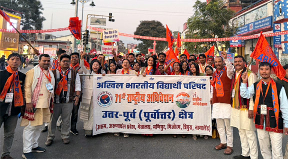 उत्तराखण्ड: 29 नवंबर 2025 शनिवार को देहरादून। अखिल भारतीय विद्यार्थी परिषद (अभाविप) का 71 वाँ राष्ट्रीय अधिवेशन 28 से 30 नवंबर के मध्य देवभूमि, उत्तराखण्ड के परेड ग्राउंड में बसाए गए ‘भगवान बिरसा मुंडा नगर’ में जारी है। इस अधिवेशन स्थल से निकलकर दर्शनलाल चौक तक 4.5 किमी लंबी शोभायात्रा आयोजित हुई। इसमें देश के सभी राज्यों से आए 1500 से अधिक विद्यार्थियों की सहभागिता से लघु भारत के दर्शन हुए। सड़कों पर उमड़ी इस युवा तरुणाई का देवभूमि के नागरिकों ने जगह-जगह स्वागत करते हुए ‘भारत माता की जय’ का उद्घोष किया।