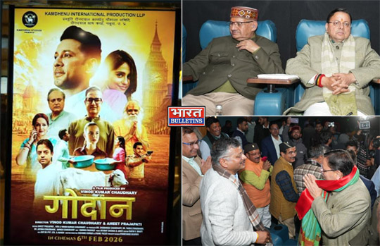 उत्तराखण्ड: 11 Feb. 2026 बुधवार को देहरादून/राजधानी स्थित सेन्ट्रियो मॉल, हाथीबड़कला में मुख्यमंत्री श्री पुष्कर सिंह धामी ने गाय संरक्षण पर आधारित फिल्म ‘गौदान’ का अवलोकन किया। इस अवसर पर उन्होंने फिल्म की विषयवस्तु को भारतीय संस्कृति, ग्राम्य जीवन और गौ-संवर्धन की परंपरा से जुड़ा अत्यंत सार्थक एवं प्रेरणादायी प्रयास बताया।